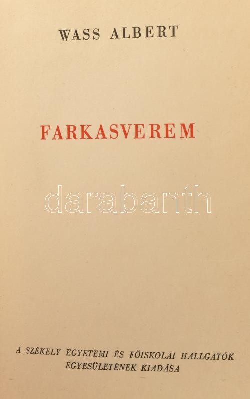 Wass Albert: Farkasverem. Bp., é.n. Szefhe, Egészvászon kötésben, kiss... https://www.darabanth.com/hu/390-Gyorsarveres/390.0/Konyvek/Konyvek-Egyeb-ritkasagok~1000019/Wass-Albert-Farkasverem-Bp-en-Szefhe-Egeszvaszon-kotesben-kisse-kopott~II2348880