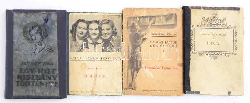 4 db lányregény: Ego: Tesszából Terka lesz. Bp., é.n., Singer és Wolfner. Ajándékozási sorral és tulajdonosi névbejegyzéssel + Laczkó Márta: Maris. Bp., é.n., Singer és Wolfner. + B. Büttner Lina: Egy rút kis leány története és egyéb elbeszélések. Negyedik bővített kiadás, Goró Lajos rajzaival. + Dobos Pécsi Mária: Ida. Bp., é.n., Singer és Wolfner.