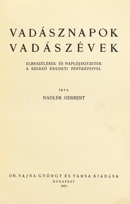 Nadler Herbert: Vadásznapok. Vadászévek. Elbeszélések és naplójegyzetek a szerző eredeti fényképeivel. Bp., 1937., Dr. Vajna György és Társa, (Athenaeum-ny.), 279 p. 24 egészoldalas táblával. Kiadói aranyozott egészvászon-kötés, szétvált kötéssel, kijáró lappal