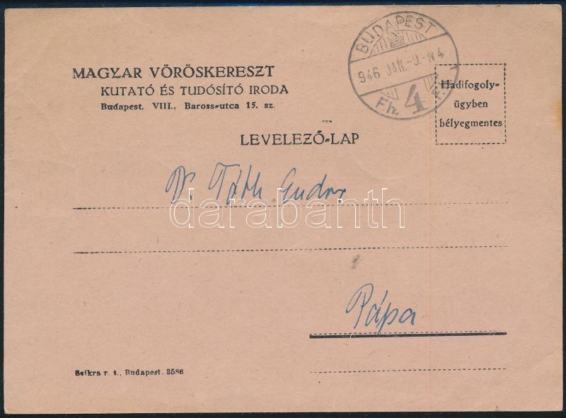 Leírás: 1946 Magyar Vöröskereszt Kutató és Tudosító Iroda levelezőlapja hadifogoly ügyben Pápára küldve