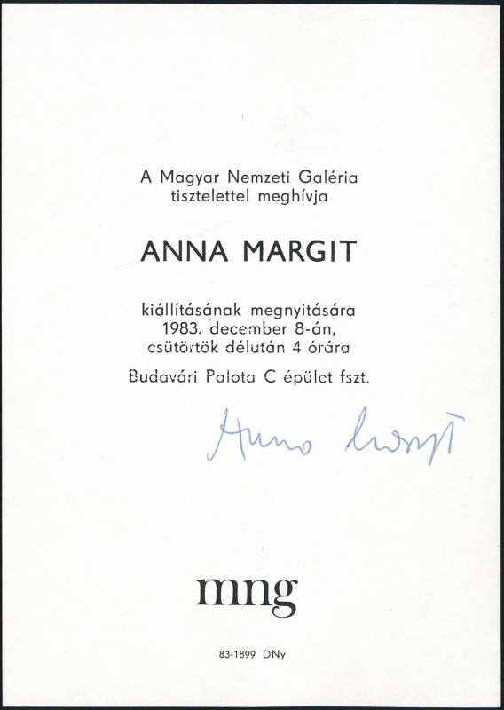Leírás: Anna Margit (1913-1991) festőművész aláírása kiállítás meghívóján