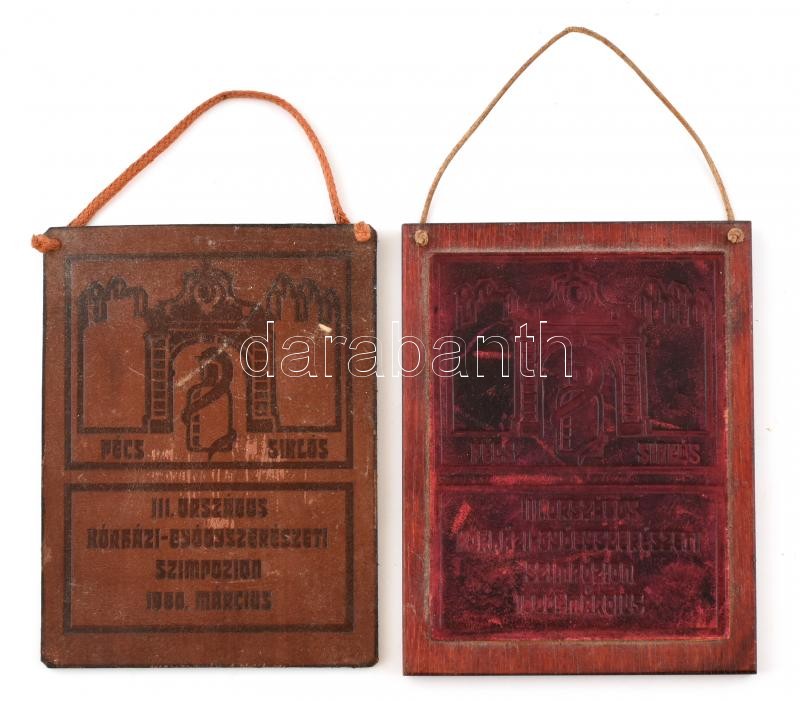 1980 Pécs-Siklós, III. Országos Kórházi-Gyógyszerészeti Szimpózium, 1980. március, falra akasztható bőr (emlék) plasztika fatáblán, és bőr kép, összesen 2 db azonos szöveggel! 16x12 cm