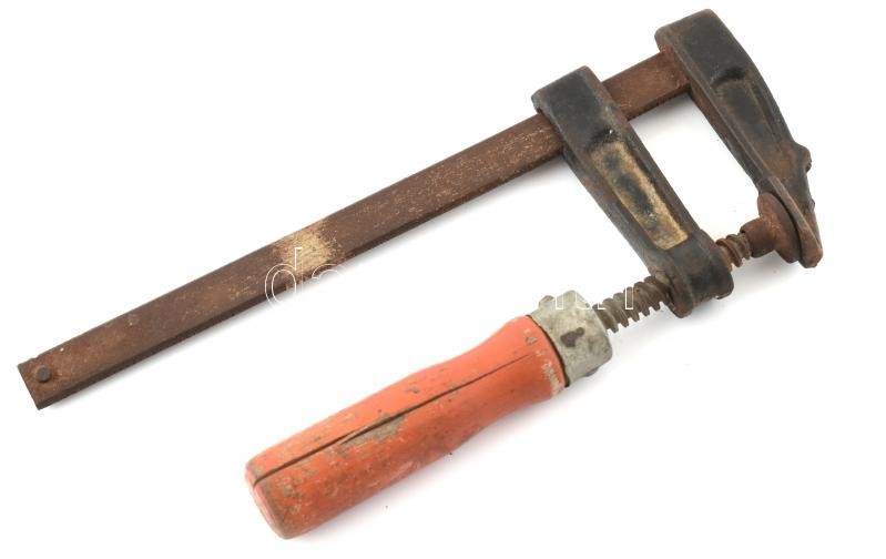 Leírás: Asztalos fa nyelű kézi szorító, kopott, h: 20,5 cm