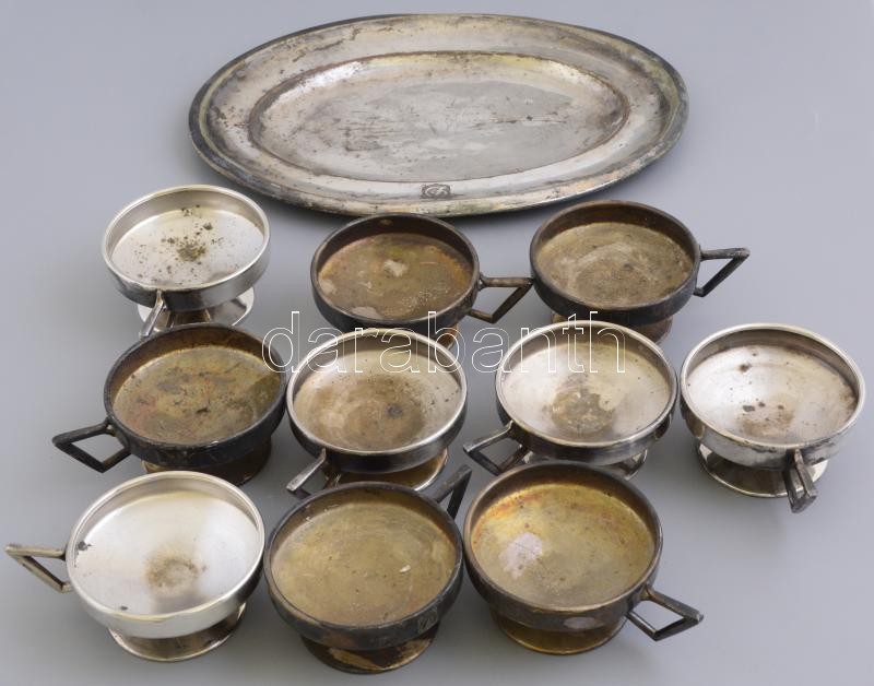 Leírás: Dunacorso alpakka fém tálca + 10 db csésze, néhány rozsdás, 32x22,5 cm és 9x4,5 cm