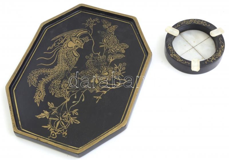 Japán fekete lakkfa tálca, kézzel festett madár ás virág dekorral, éleinél apró sérülésekkel, 25×19 cm + Lakkfa-gyöngyház hamutál, peremén kézzel festett virág dekorral, d. 9 cm, m: 2 cm