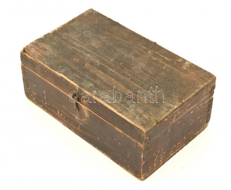 Régi fa varróládika, kopott, benne kb. 500 db gomb, cérnák, olló, fém gyűszű + Boldog karácsonyt! feliratú fém korong a Halászbástya képével, kilyukasztva