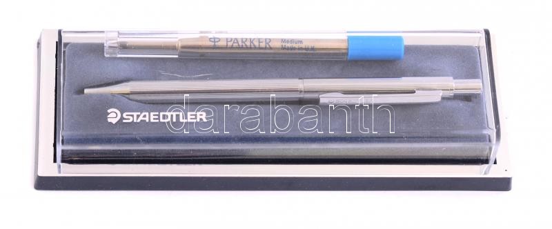 Leírás: Staedtler ezüstszínű golyóstoll újszerű állapotban, kissé sérült eredeti műanyag dobozában + 1 Parker golyóstoll betét