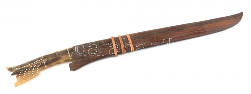 Leírás: Toraja / Toradzsa jelzéssel indonéz törzsi tőr. Szaru markolat, fa hüvely. élezett penge. 52 cm
