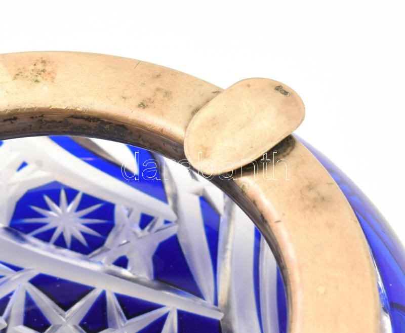 Leírás: Ezüst (Ag) szélű kristály hamutál, jelzett, jó állapotban, d: 13 cm
