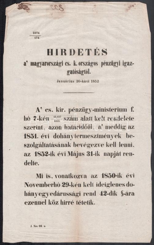 1852 Hirdetés a magyarországi cs. k. országos pénzügyi igazgatóságtól ... https://www.darabanth.com/hu/390-Gyorsarveres/390.0/Mutargy-papirregiseg-egyeb/Nyomtatvanyok~500033/1852-Hirdetes-a-magyarorszagi-cs-k-orszagos-penzugyi-igazgatosagtol-dohany-rendelet~II2346185