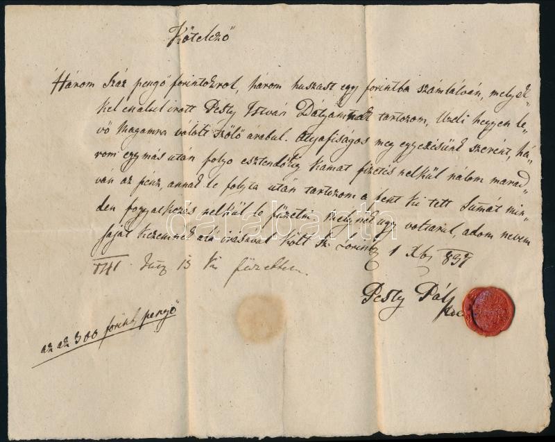 1837 Nemes Pesty Pál uzdi (Sárszentlőrinc) földbirtokos, Batthyány Lajos miniszterelnök keresztapja saját kézzel írt és aláírt adósságlevele családi tartozásról, viaszpecséttel