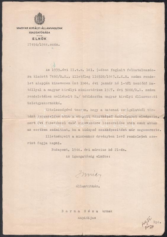 Leírás: 1944 Kinevezési okmány Imrédy Kálmán MÁV elnök, államtitkár saját kezű aláírásával