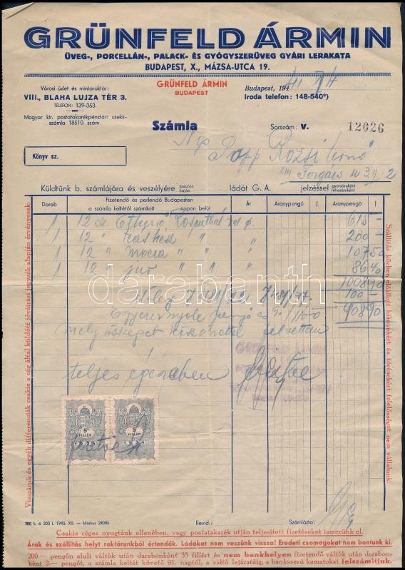 1941 Grünfeld Ármin üveggyár számla https://www.darabanth.com/hu/390-Gyorsarveres/390.0/Mutargy-papirregiseg-egyeb/Reklam~500023/1941-Grunfeld-Armin-uveggyar-szamla~II2353546