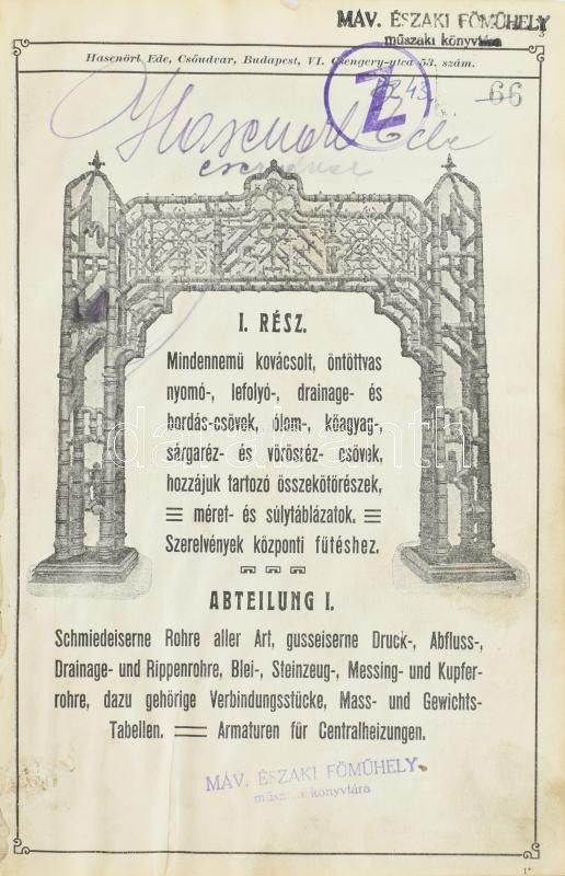 Leírás: Hasenörl Ede, Csőudvar, Bp. Árjegyzék. É.n. (1910 körül). 726p. Magyar és német nyelven. Fekete-fehér ábrákkal gazdagon illusztrált. Félvászon kötésben, kopott borítóval, intézményi bélyegzőkkel.