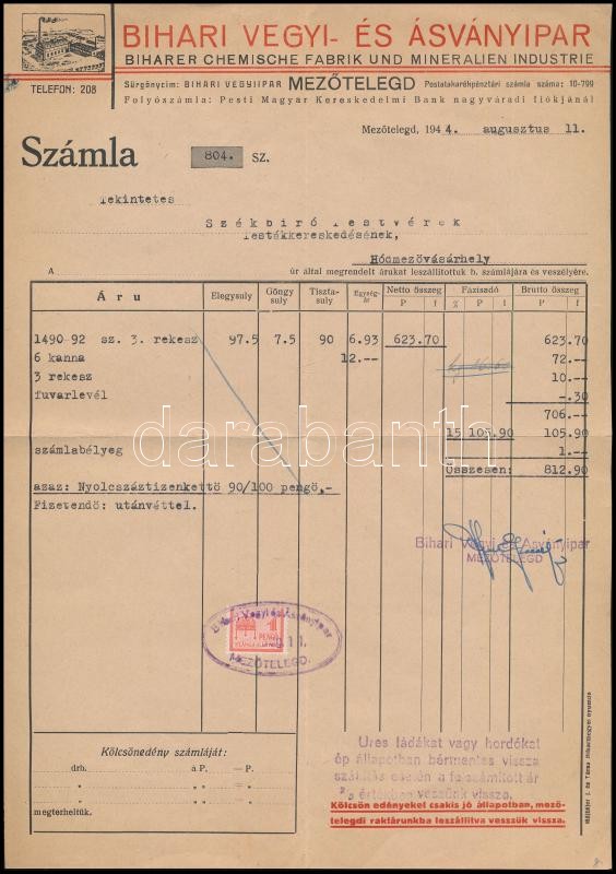 Leírás: cca 1930 Mezőtelegd vegyi gyár számla