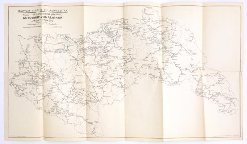 cca 1941 Magyar Királyi Államvasutak közúti gépkocsiüzem (MÁVAUT) autóbuszvonalainak átnézeti térképe és vasúti hálózati térképe, két oldalas térkép, tervezte: Tallián Ferenc, Bp. Magyar Földrajzi Intézet Rt., 33x58 cm.