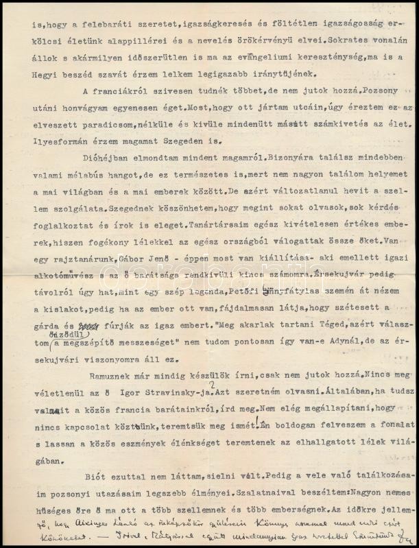 cca 1940 Krammer Jenő (1900-1973): irodalomtörténész, egyetemi tanár autográf írással és aláírással kiegészített gépelt levele melyben szellemi kérdések mellett Pozsonyhoz húzó honvágyáról ad számot .
