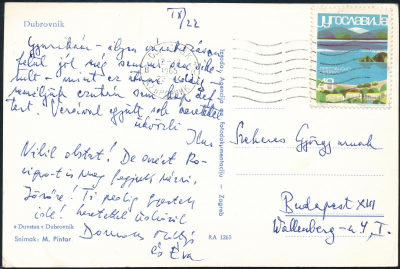 cca 1960 Domokos Mátyás (1928-2006) irodalomkritikus, irodalomtörténész, szerkesztő, könyvtáros és felesége Sebestyén Ilona saját kezű üdvözlősorai, aláírásaikkal Dubrovnikból Szekeres György (1914-1973) újságíró, műfordító, az Európa Kiadó főszerkesztője részére.
