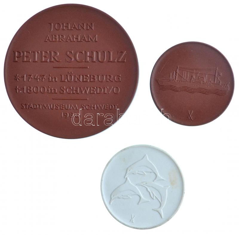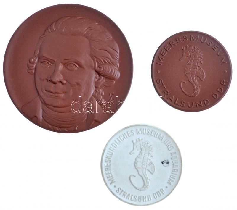 Leírás: NDK 1980. "Johann Abraham Peter Schulz - Stadtmuseum Schwedt 1980" jelzett meisseni porcelán emlékérem, eredeti tokban (63mm) + DN "Meermuseum - Stralsund DDR" jelzett meisseni barna porcelán emlékérem (39mm) + DN "Meereskundliches Museum und Aquarium - Stralsund DDR" jelzett meisseni fehér porcelán emlékérem (40mm) T:1,2-