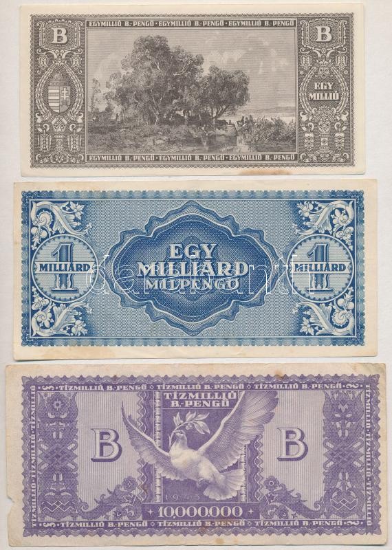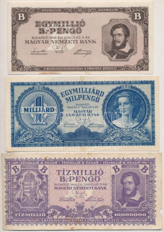 Leírás: 1946. 1.000.000.000MP + 1.000.000BP + 10.000.000BP T:II-,I-, III kis papírhiány, kis ragasztónyom mindegyiken Adamo P34, P37, P38