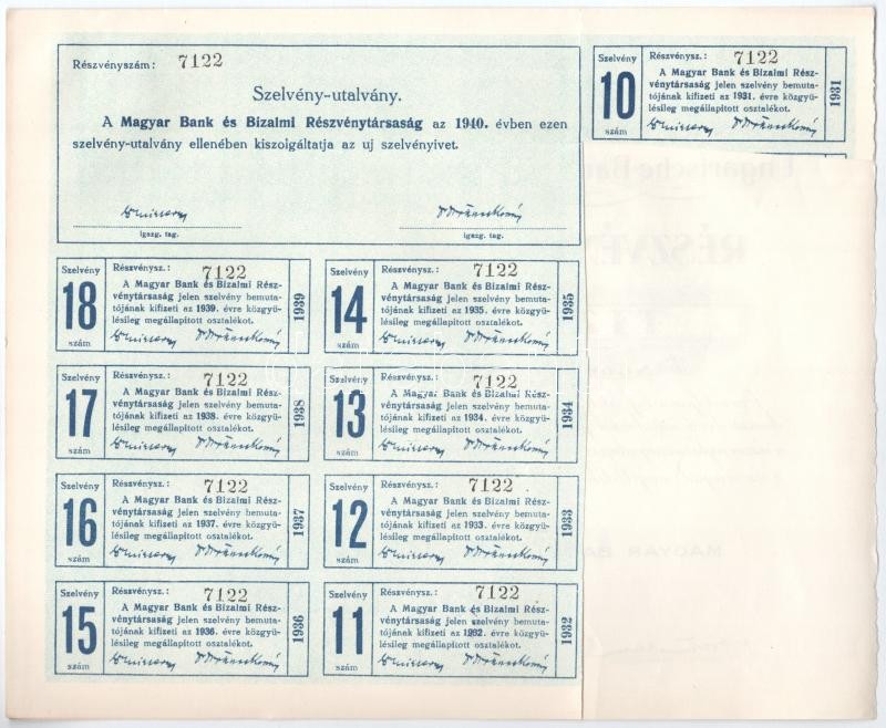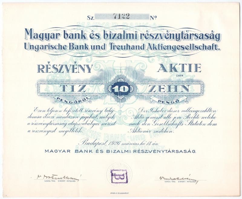 Leírás: Budapest 1926. "Magyar bank és bizalmi részvénytársaság" részvénye 10P-ről, szelvényekkel, szárazpecséttel, bélyegzéssel T:I-