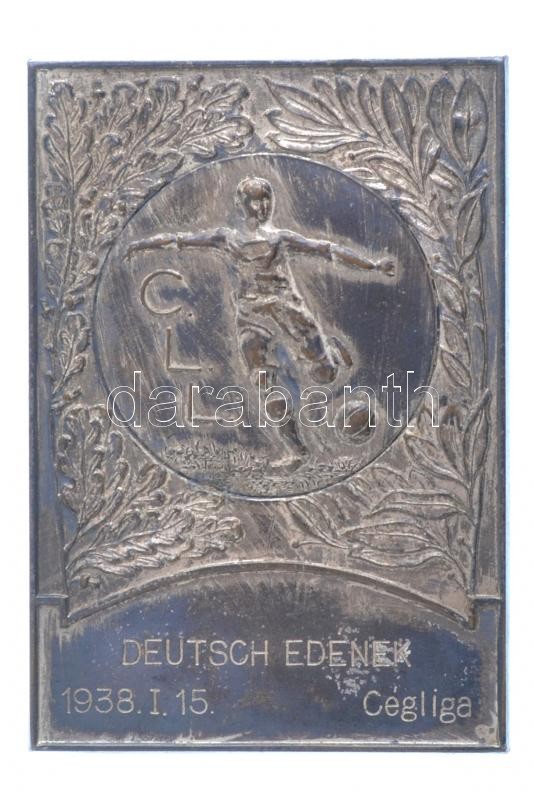 Leírás: Fonyó Márton (1896-1989) 1938. "C.L.L. (Cégcsapatok Labdarúgó Ligája)" egyoldalas fém plakett "DEUTSCH EDÉNEK - 1938. I. 15. CÉGLIGA" gravírozással, eredeti tokban (80x56mm) T:1-