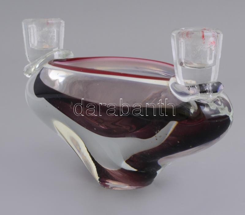 Leírás: Kétágú színes üveg gyertyatartó, közepén tálka szerű mélyedéssel, apró kopásnyomokkal, m: 12 cm, h: 20 cm