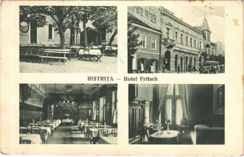 1940 Beszterce, Bistritz, Bistrita; Hotel Fritsch szálloda és étterem, autóbusz, kerthelyiség, étkező, szoba belső / hotel, restaurant, autobus, garden, dining room, interior (fl)