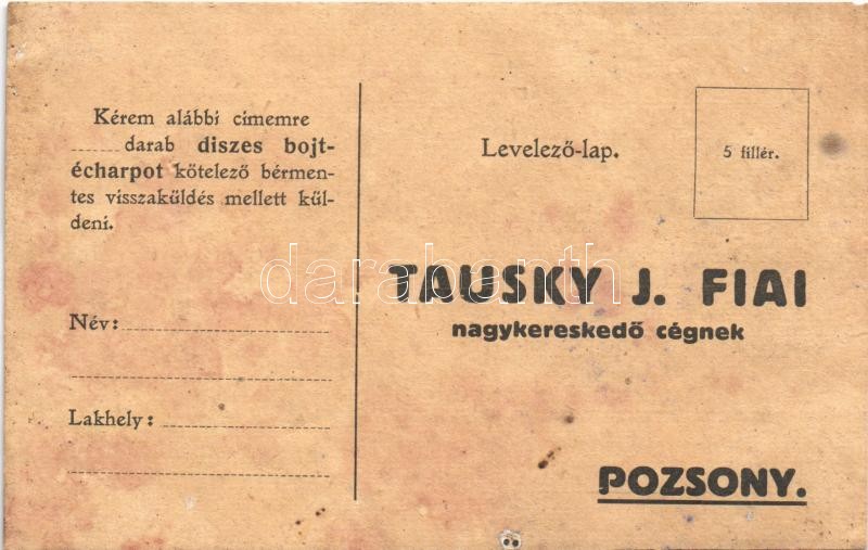 Leírás: Pozsony, Pressburg, Bratislava; "Echarpok díszes bojtokkal" Tausky J. Fiai ruhakereskedő cég reklám levelezőlapja / shop advertising card (r)