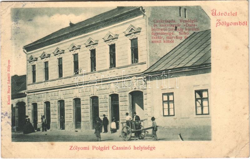 Zólyom, Zvolen; Polgári kaszinó, cukrászda, vendéglő és szikvízgyár, "Duna" biztosító társaság kerületi ügynöksége, Sírkő raktár, márvány és sienit kőből. Nagy László kiadása / casino, confectionery, restaurant, inn, insurance company, tombstone warehouse (EB)