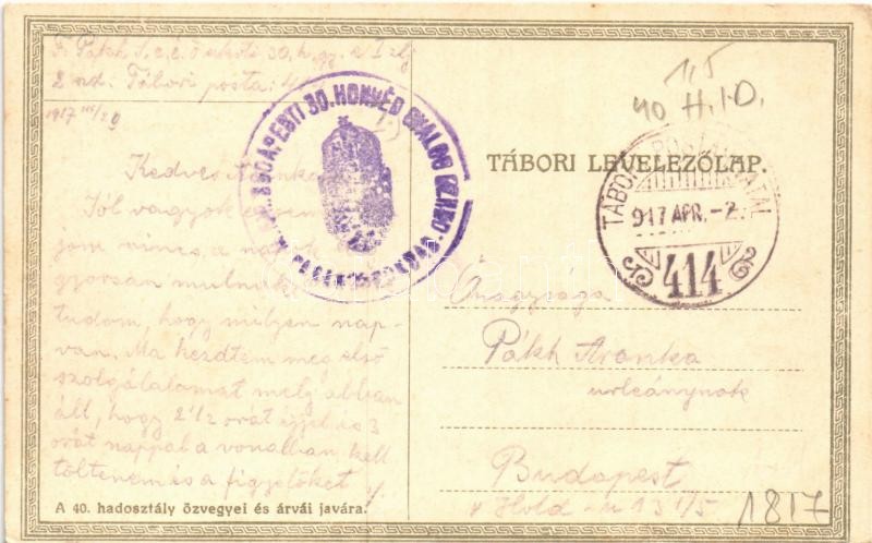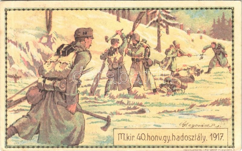 1917 M. kir. 40. honvéd gyaloghadosztály özvegyei és árvái javára. Lengyel Lipót műintézete / WWI Austro-Hungarian K.u.K. military art postcard, charity fund. litho s: Glogovácz + "M. kir. budapesti 30. honvéd gyalogezred" (EK)