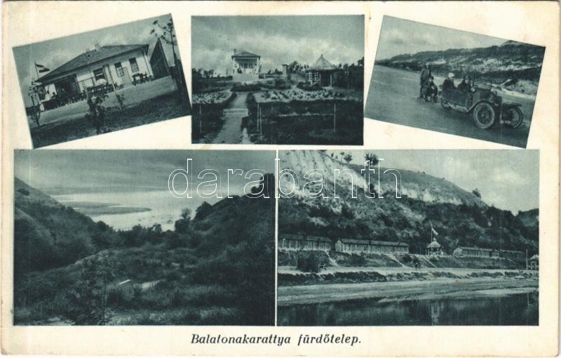 Leírás: Balatonakarattya, nyaraló, villa, automobil és szánkó a befagyott Balatonon, téli sport, fürdőtelep (gyűrődés / crease)