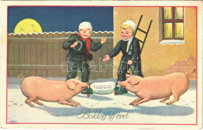 1942 Boldog Újévet! / New Year greeting art postcard, chimney sweepers... https://www.darabanth.com/hu/391-Gyorsarveres/391.0/Kepeslapok/Udvozlolapok-Unnepek~1000089/1942-Boldog-Ujevet-New-Year-greeting-art-postcard-chimney-sweepers-with-pigs-EK~II2366295