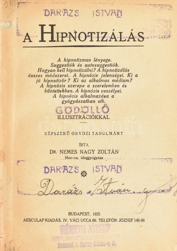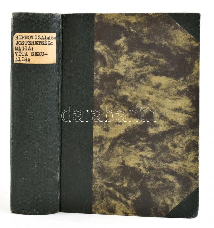 Kolligátum, 4 műből, egybekötve: Nemes Nagy Zoltán: A hipnotizálás. Bp., 1925, Aesculap, 24, 25-122+6 p.; özv. Dominits Gyuláné: A jóstehetség. Bp., 1922, Révai, 8 p.; Alexy E.: Mágia. Fehér mágia - Fekete mágia - Kabbala. Hn., én., nyn., címlap, 30+2 p.; Nemes Nagy Zoltán: Vita sexualis. Az ember nemi élete. Bp., 1926, Aesculap, 304 p. Átkötött kissé kopott félvászon-kötés.