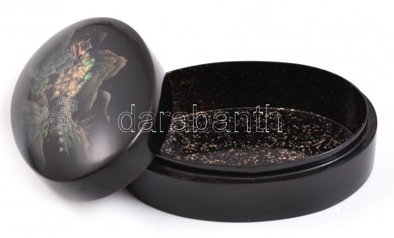 Leírás: Műanyag doboz, fedelén kézzel festett távol-keleti stílusú tájképpel, m: 4 cm, 10x6,5 cm