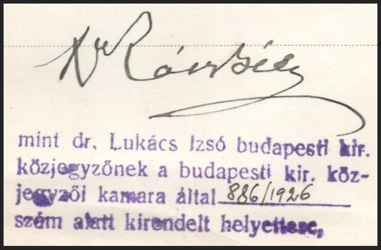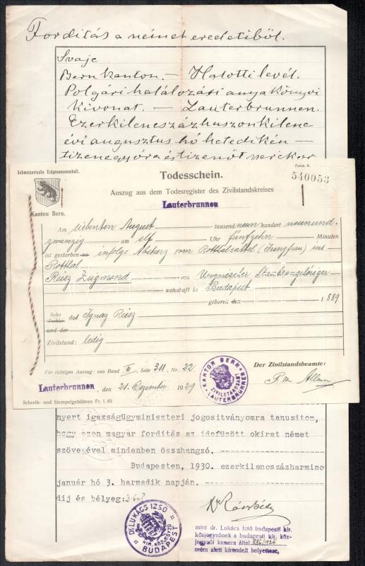 Leírás: 1930 Bp., németből fordított dokumentum, közjegyzői aláírással