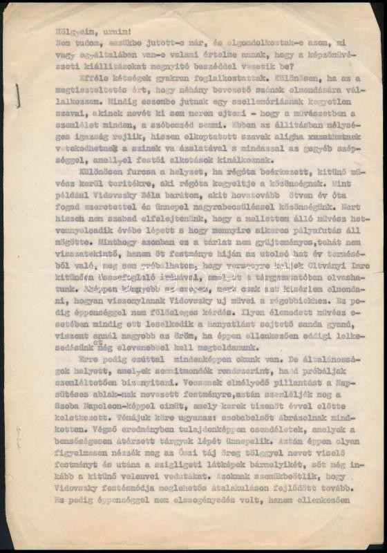 Leírás: 1961 Kiállítási megnyitó beszéd Vidovszky Béla (1883-1973) festőművész Csók István galériabeli kiállításáról, gépelt, 2p