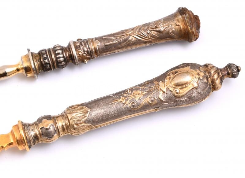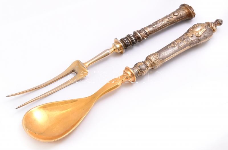 Leírás: Ezüst (Ag) nyelű tálaló kanál és villa. Jelzett, egyik sérült 25 cm