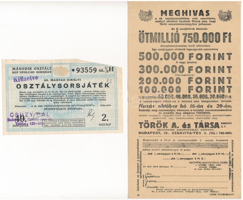 Vegyes: 1941. "Magyar Királyi Postatakarékpénztár" betétkönyve, bejegyzésekkel + 1942. "Magyar Királyi Osztálysorsjáték Hivatalos Nyeremény-jegyzék" + 1942. "49. Magyar Királyi Osztálysorsjáték" második osztály egy nyolcad sorsjegye + ~1949. "Török A. és Társa Bankház Rt." osztálysorsjátékra szóló felhívása (2x) +