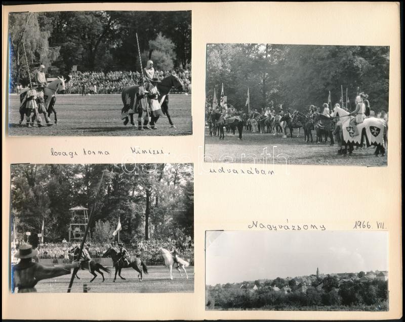 Leírás: 1966 Hagyományőrző lovagi tornák Nagyvázsonyban, török-magyar harc, kurucok-labancok, Kinizsi és udvara, 24 fotó kartonon, feliratozva, jó állapotban, 9×12 cm