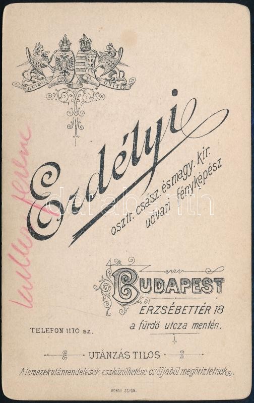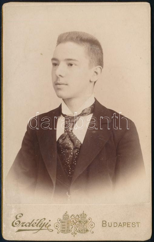 cca 1890-1900 Kuller Ferenc fiatalúr portréja, keményhátú fotó, Erdélyi Mór (1866-1934) osztrák cs. és magyar kir. udvari fényképész budapesti műterméből, 10x6 cm