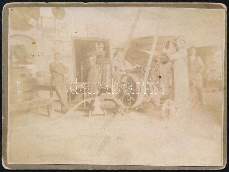 Leírás: cca 1900 Felvétel bor készítéséről, szüret után, gépekkel, présekkel, munkásokkal, fotó kartonon, jelzés nélkül, kopott, 8x11,5 cm