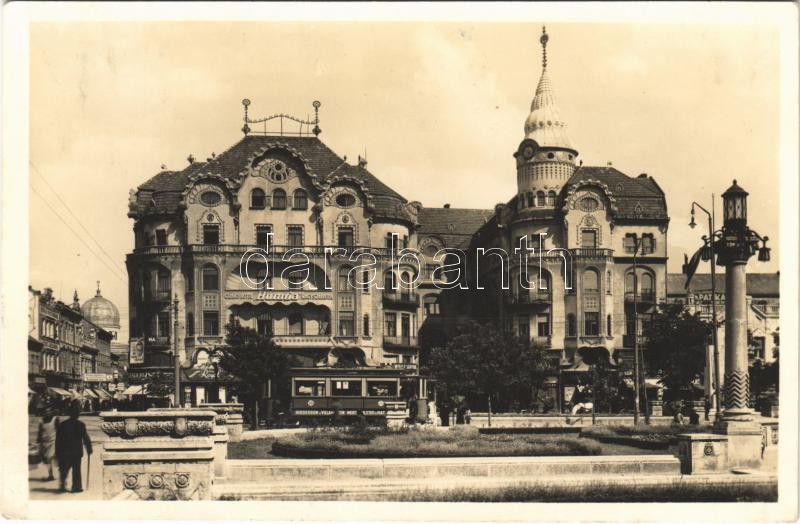 Nagyvárad, Oradea; Szent László tér, villamos, patika, Royal, Herskó József, Weisz Sándorné üzlete, Hunnia nagyszálloda / square, tram, shops, hotel, pharmacy + So. Stpl