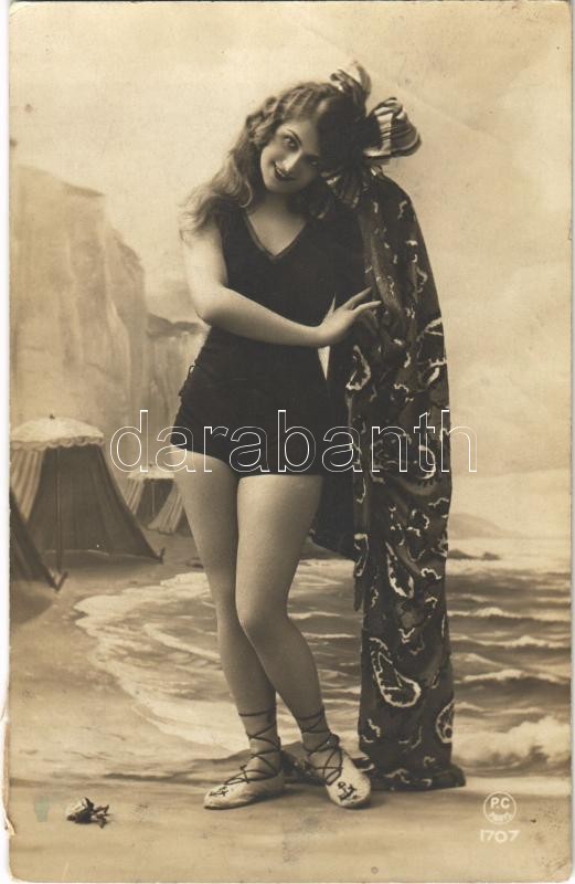 Leírás: 1925 Gently erotic lady in swimsuit. P.C. Paris 1707. (EK)