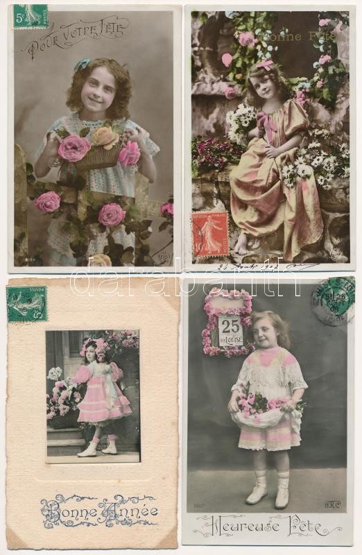 Leírás: 9 db RÉGI motívum képeslap vegyes minőségben: üdvözlő gyerek, hölgyek / 9 pre-1945 motive postcards in mixed quality: greeting children and lady