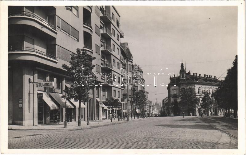 Leírás: Budapest II. Olasz fasor (Szilágyi Erzsébet fasor), Stühmer üzlete, Polgári egyenruha szabó, Fővárosi tej itt, Patika, Marton gyógyszertár