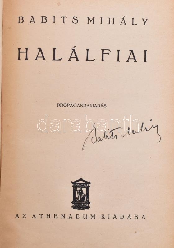Leírás: Babits Mihály: Halálfiai. Propagandakiadás. Bp.,[1935],Athenaeum, 695+1 p. Kiadói kopott, foltos aranyozott egészvászon-kötés, firkált elülső szennylappal, laza kötéssel. A szerző, Babits Mihály (1883-1941) által aláírt példány.