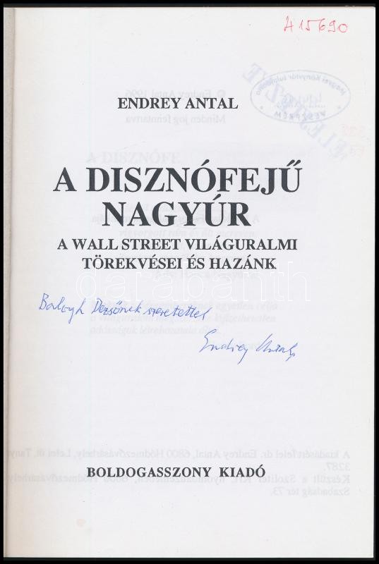 Endrey Antal: A disznófejű nagyúr. A Wall Street világuralmi törekvései és hazánk. Hódmezővásárhely, 1996, Szerzői kiadás. Kiadói papírkötés, volt könyvtári példány.