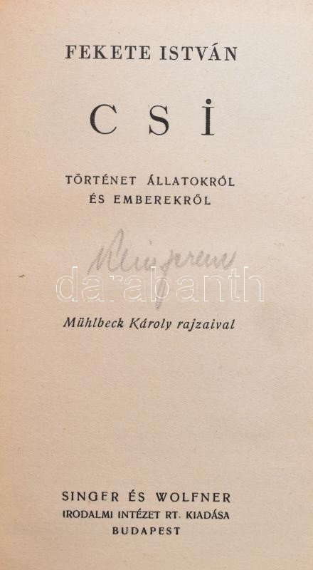 Fekete István: Csí. Történet állatokról és emberekről. Mühlbeck Károly rajzaival. Bp.,(1940),Singer és Wolfner, 244 p. Első kiadás. Kiadói kissé kopott, kissé foltos egészvászon-kötésben.