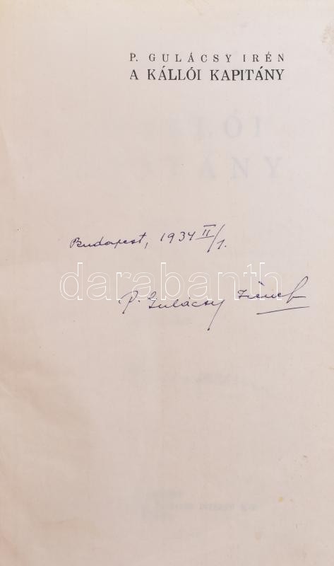 P. Gulácsy Irén: A kállói kapitány. I-II. köt. Bp., 1934,Singer és Wolfner, (Hungária-ny.), 291+1;2+326+2 p. Első kiadás. Kiadói piros egészbőr-kötésben, kopott, kissé sérült, javított gerinccel, kissé szakadt címlappal. A szerző, P. Gulácsy Irén (1894-1945) által aláírt, dátumozott példány.